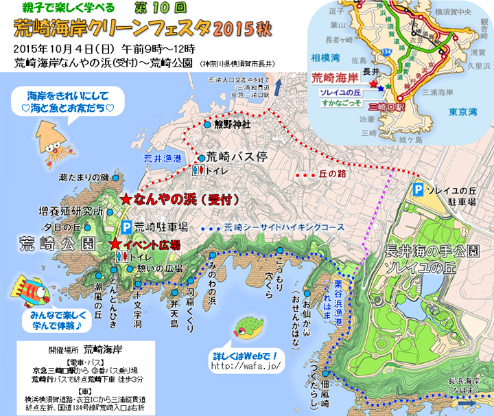 クリーンフェスタ終了後、荒崎シーサイドハイキングコース(下図青い点線)の磯歩きや、ソレイユの丘でのアトラクションを楽しまれてはいかがでしょうか♪ |