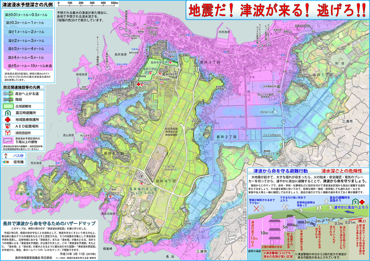 津波の最新知識を御伝授くださいました研究者の皆様、マップ作成に的確な助言をくださいました津波防災の専門家の皆様、マップ作成を決意せざるを得ない答弁を下さった横須賀市長様・市長室長様、マップ作成に必要な情報をご提供くださいました横須賀市職員の皆様、津波ハザードマップに関する話に耳を傾けてくださいました横須賀市議会議員の皆様、長井地域運営協議会 防災部会はじめ長井の皆様、